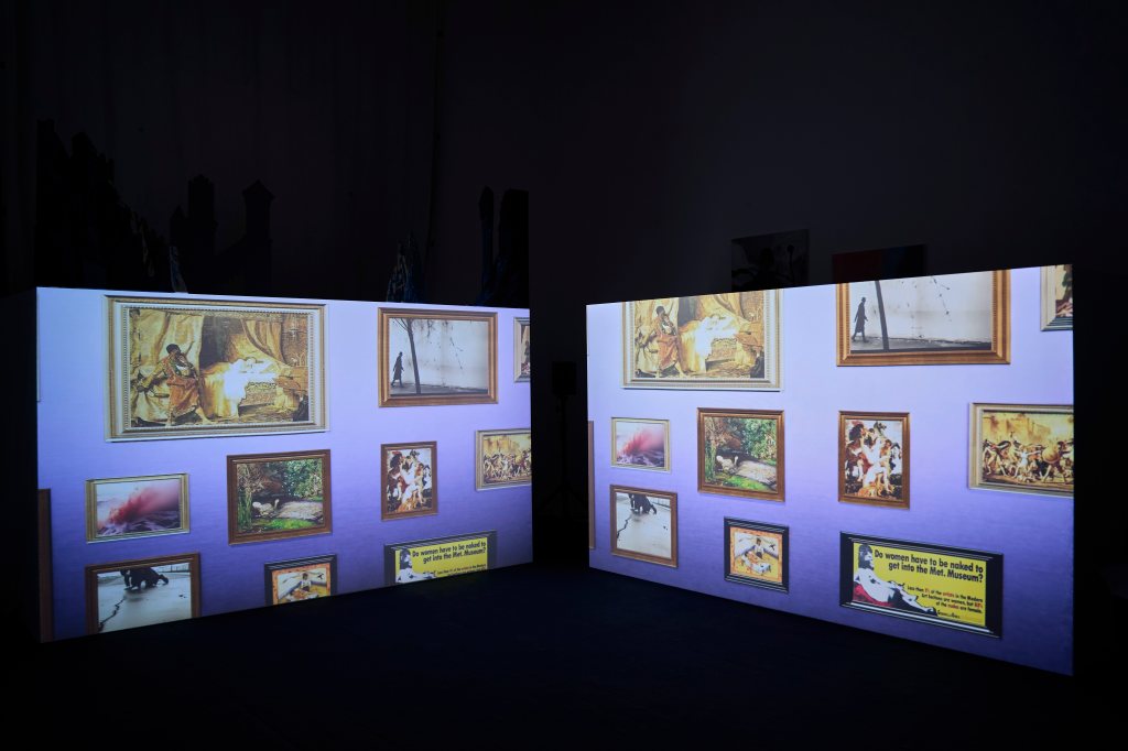 In the exhibition hall, there are two upright screens, one positioned in the center of the space and the other on the right side.