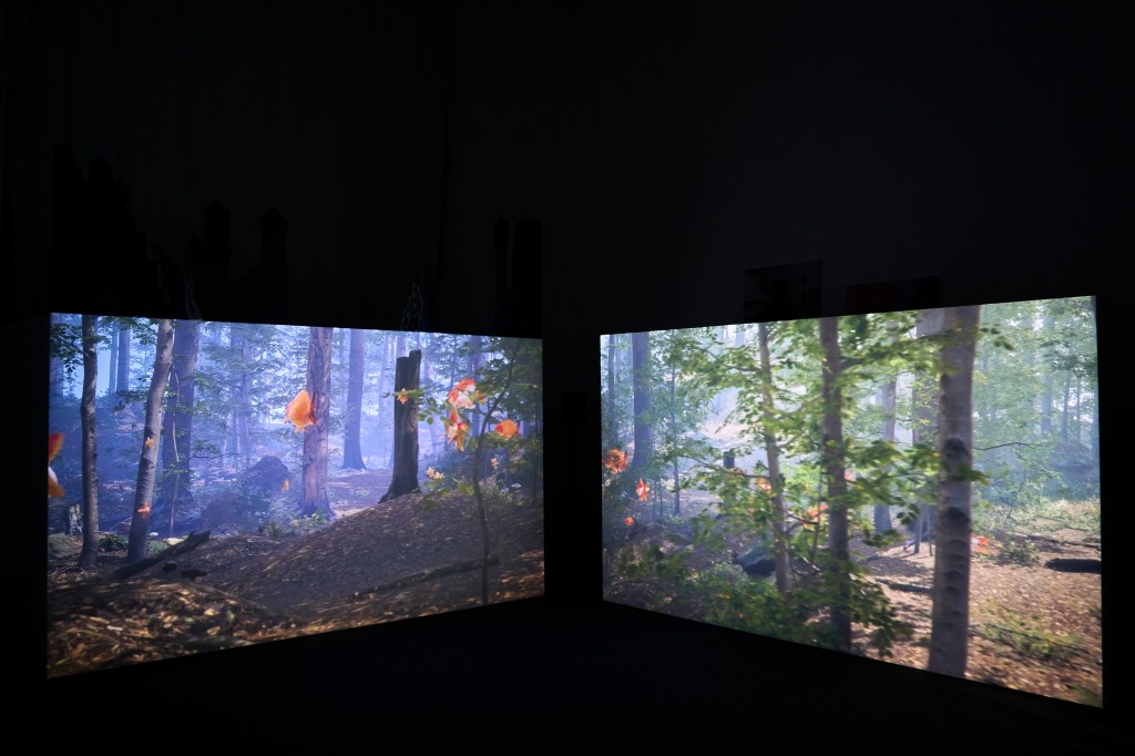 The second act shifts to a forest from a first-person perspective, with sunlight streaming through the gaps in the trees and gentle breezes rustling the leaves. Our view wanders along a path in the woods, and suddenly, some goldfish swim into view from the middle screen, while on the right side, goldfish and the forest are seen from another angle. Accompanied by background sounds and the goldfish, the audience gently enters this dreamlike state.