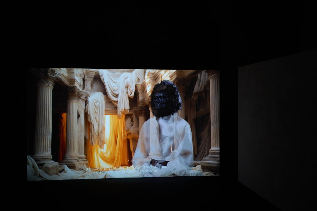 第四幕场景切换到一个戴着猩猩头套(致敬20世纪80年代的激进团体“游击队女孩”),身着白色睡袍的幽灵正在接受采访。睡袍是她根据苔丝在卧室里的穿着设计,睡袍的立领做了缝合褶皱,重叠的部分做了加宽处理,使用汉服左衽的概念,左阳右阴,隐喻着这是位死去的灵魂 。杨柳西子看《奥赛罗》的时候在想,苔丝死之前发生了什么,这个死亡有些突然,也许是循序渐进的,也许早就有预兆。