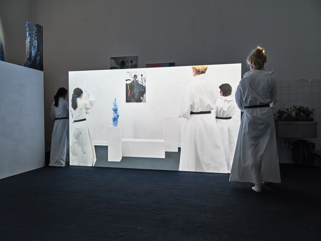 第一幕右侧荧幕出现,三个穿着白色睡袍的守卫守护在形态各异的贾科梅蒂风格的钟乳石附近(这精确的描述来自于杨柳西子的清晰之梦 ),一切从洞穴里开始的,洞穴古往今来都具有某种原初的力量。屏幕中的主角们时而站,时而坐,墙上时不时会出现一些不同色彩的抽象画,相对静止的片段变换了几次后,她们三人分别挑选了其中一个雕塑(钟乳石)走出了屏幕外,屏幕即是洞穴,又或说是梦的门槛,人们端着洞穴中的艺术品(钟乳石),踏过了梦之门槛,惊喜的出现在展览的现场,至此《淤青》慢慢地隐入了另一幕。