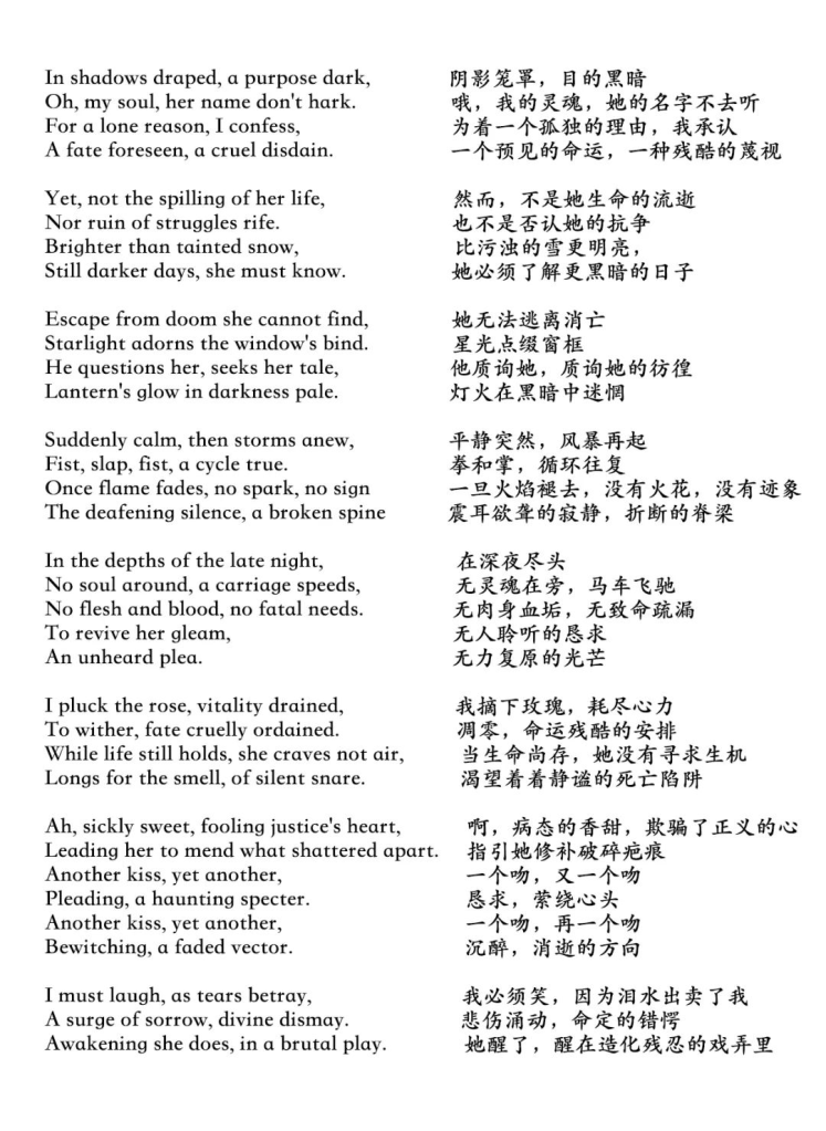 The third act transports the dream to a dilapidated castle resembling a Roman amphitheater, with real castle paintings connected to the scene. Clouds intermittently obscure the moon in the sky, and torches on the castle flicker. As a large circular spotlight above the stage illuminates, actors start performing a Shakespearean-style English poem relay, written by the author and ChatGPT, adapted from Desdemona’s experiences and narrative as a soul over several centuries.