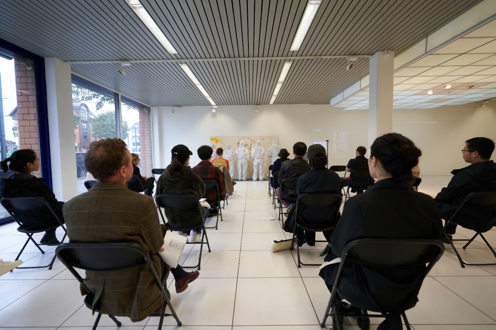 Around 30 minutes later, we completed our creation and exited the hall. I left the team and took off my protective suit. Underneath the suit I dressed formally. Then I took out a gavel, stood behind a lectern and started an auction of the painting which we had just finished. Anyone was welcomed to participate in the auction. However, bidders were confined to bidding for only a part of it, instead of the whole painting. But still, there were bidding frenzies. The winning bidders cut out the parts they won on site and took the parts away.