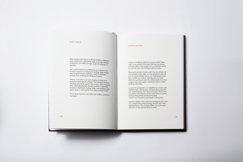 这是一本手工装订的书,书里记载了Irina的1001个梦,她用著名的童话1001夜为题,希望收集到1001个梦。梦已然成为了她作品中重要的题材,于是她用日记的形式将梦记录下来,使其成为一个档案,每当她需要一些灵感或素材时,就可以检索档案,获得作品来源。