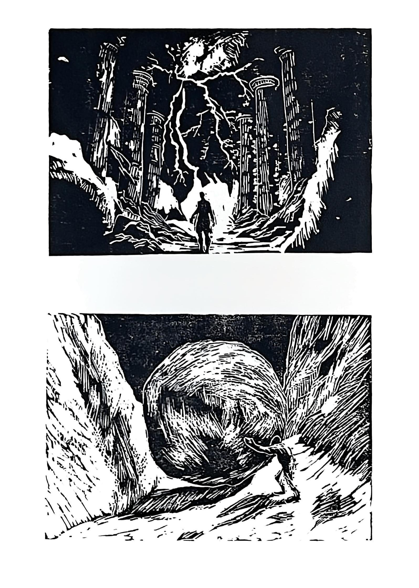 It depicts Sisyphus pushing a boulder up the hill, only to helplessly watch it roll back to the starting point.
